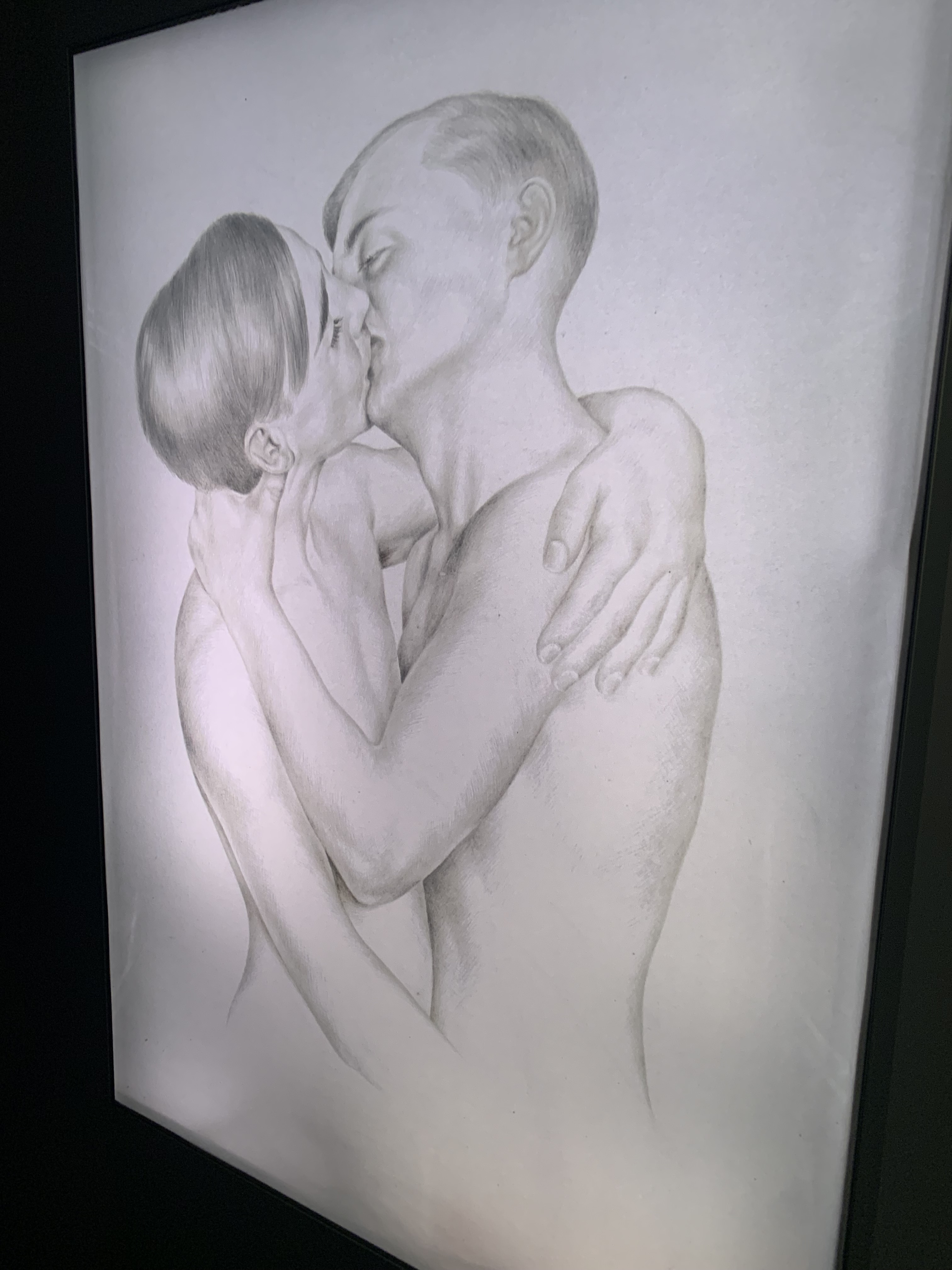 To understand how the Holocaust came to be, though, the exhibit takes visitors through the run-up the 1930s with the aftermath of WWI, the punishing (for Germany) Treaty of Versailles, and the Weimar Republic years before Hitler ascended to power in 1933 and quickly turned Germany into a dictatorship. One of the interesting tidbits from the Weimar Republic years was that some Germans saw it as a time of “opportunity and innovation.” Artist Richard Grune, a gay man, founded a democratic, self-governing camp for working-class children. Unfortunately, he was arrested for being gay and spent 11 years in prison. The reason I find it interesting is you don’t often hear about the positives of the Weimar Republic, although that story had a negative ending. As another example, Christian Schad was an artist during the time who explored “homoerotic themes, reflecting a period of cultural openness.” Pictured below is one of his drawings on display.