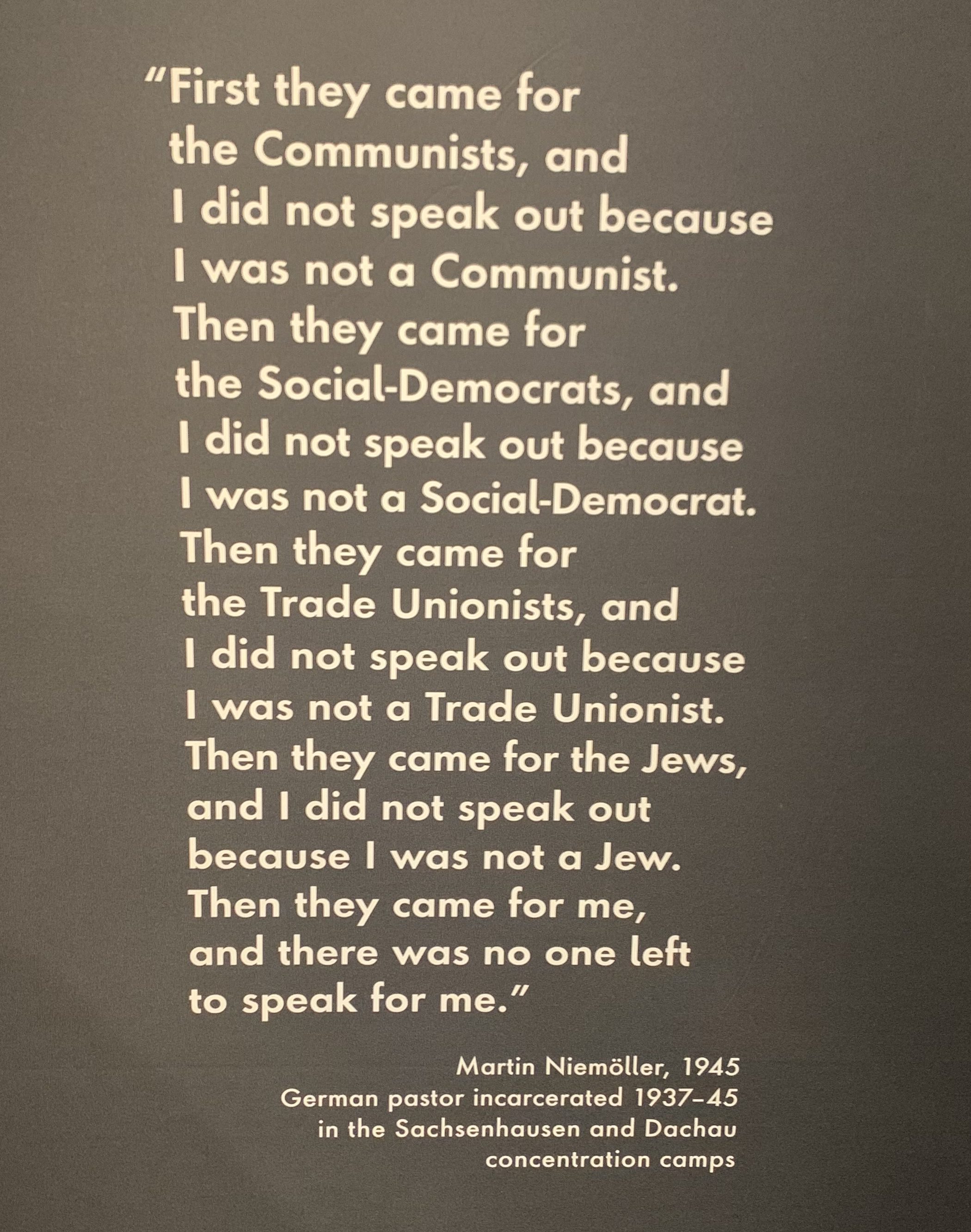 Returning to the banality of evil point, it isn’t to absolve the Nazis by any measure. That the mass slaughter of Jews became such a bureaucratic machine doesn’t mean there weren’t those enthusiastically cheering on such slaughter. In one of the most haunting moments of the exhibit, we hear a snippet from Hitler’s 1939 “Prophecy as Threat” speech to the Greater German Reichstag (legislature) on the sixth anniversary of his appointment as chancellor, where with invective, he stated, “We will annihilate the Jewish race from the Earth.” The chilling part wasn’t that statement, which one would expect to hear from Hitler, but that everyone hearing it in the legislature cheered uproariously. Such cheering haunts me, and again, speaks to Hitler not able to carry out the genocide of the Jews alone. But I’d remiss if I didn’t point out how Rudolf Höss exemplified Arendt’s “banality of evil.” Höss was the commandant of Auschwitz and his home was located adjacent to the prisoner compound. There’s one picture in the exhibit of his family enjoying their time in the garden. In fact, Höss boasts about the garden and its joys and how he’s given everything to his wife. It made me wonder about his wife and children and what became of them (Höss was executed after the war). Three of the five children went on to live long lives, two of them well into the 21st century. Another “banality of evil” one cannot overlook is that of IG Farben, a rubber and oil company that literally set up a plant at Auschwitz, and used Jewish slave labor. While the Allies disbanded the company in 1945, it doesn’t seem clear to me any of the directors faced true justice despite some being convicted at the Nuremberg Trials. Or there’s Topf and Sons, which was the engineering company that manufactured the ovens at Auschwitz. Their executives didn’t even make it to Nuremberg.