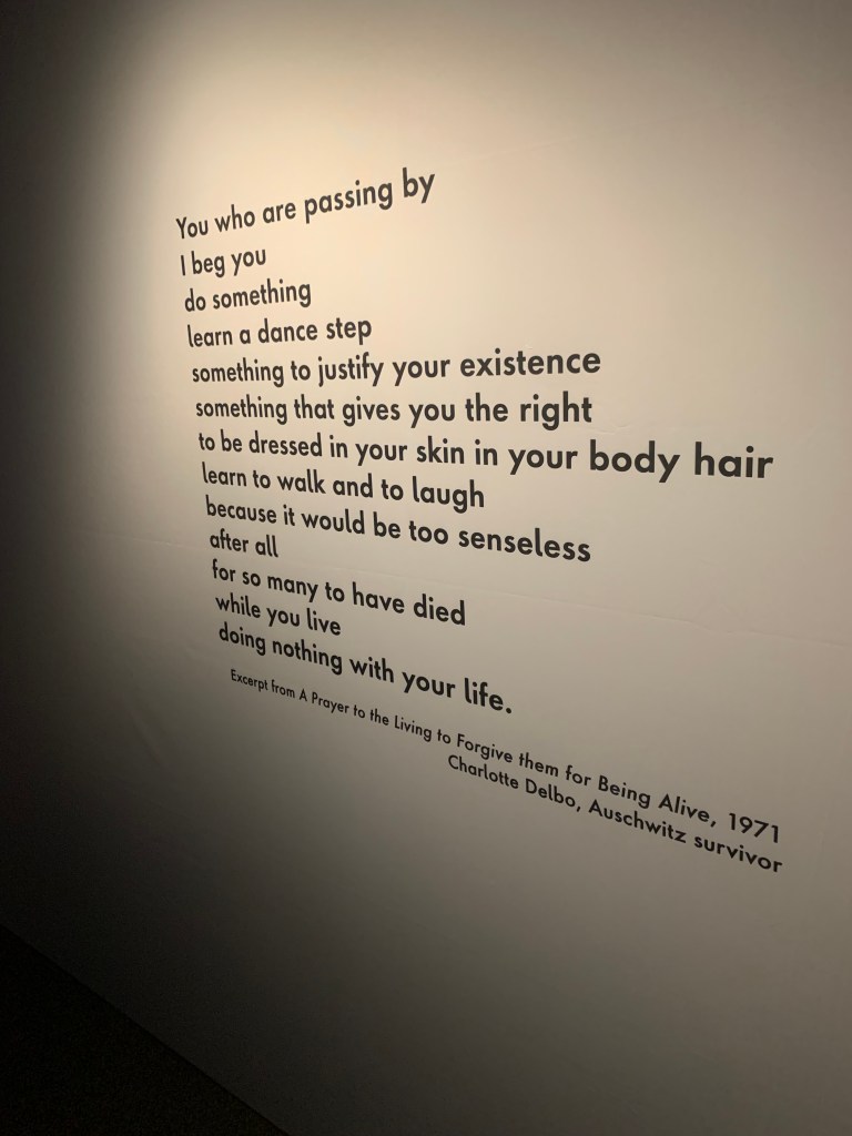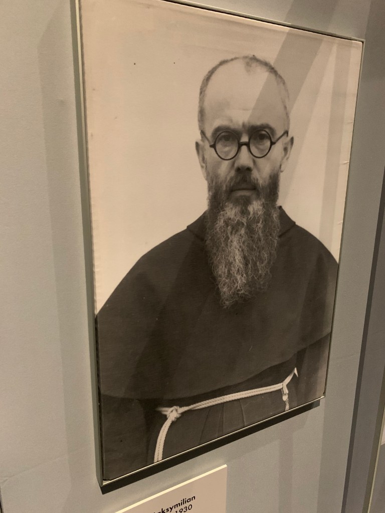 But I also talked about that indominable spirit of humanity, that unyielding intangible. One of my favorite stories of resistance during the Holocaust that represents this is that of Le Chambon-sur-Lignon, a village in southeastern France. It’s about French Protestants who saved Jews during the Holocaust led by Pastor André Trocmé. If there’s not a movie about Pastor André Trocmé and his heroism, I need it. It wasn’t just him, though, as the exhibit reminds us, “it takes a village.” Just as it “takes a village” to carry out a genocide, so, too, does it take a village to resist one. I wrote more about the village in a book review here. Resistance happened within Auschwitz as well, which is astounding to consider. One wall description noted the reason for “persistence and resistance”: “Resistance was expressed in the determination that — despite the best efforts of the SS — death in Auschwitz would not remain anonymous, and the victims would be named.” One incredible example of this was Maksymiliam Maria Kolbe, a Polish priest, a prisoner of the camp. He secretly heard confessions and encouraged others to pray despite it being prohibited. Two months after arriving, he volunteered to die in place of another inmate, Franciszek Gajowniczek, who had been sentenced to death by starvation. Kolbe was killed by the Nazis after starvation efforts failed, but Gajowniczek survived the war. Kolbe was declared a saint as a martyr by the Catholic Church in 1982. Perhaps the story that gave me the widest grin for its defiance was that of Róża Robota, who recruited women prisoners to revolt in the summer of 1944. The Nazi backlash to the uprising resulted in the death of nearly 500 people, including Robota, who was hanged publicly. As the noose was placed around her neck, she cried out, “Nekama!” (Revenge!). Bad-ass. Another one was Rivka Liebeskind, in protecting a fellow prisoner also named Rivka, who gave her a pocket knife (a featured artifact in the exhibit) and advised her, “If you get sent to the gas chambers, stab a Nazi before you go to your death.” I marvel at such people like Robota and Liebeskind. Their persistence and resistance and defiance is the best of humanity juxtaposed to the worst of humanity.