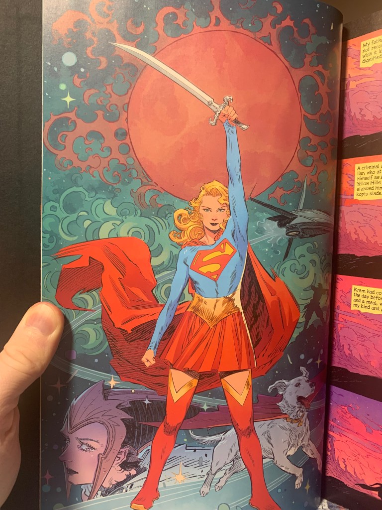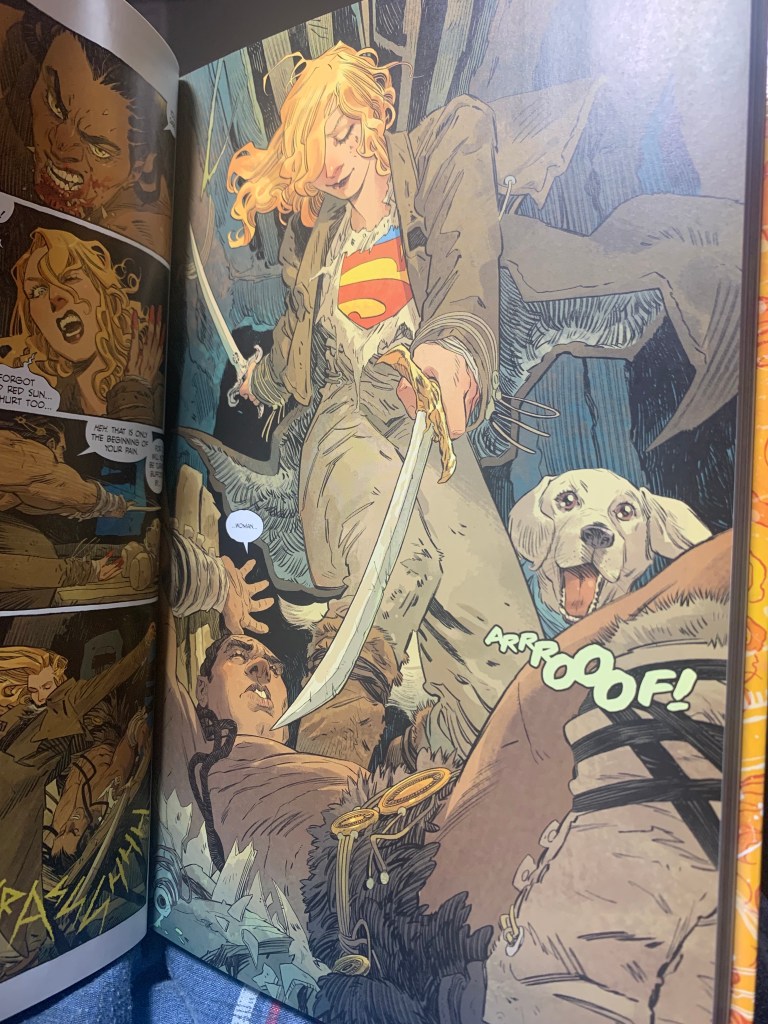 In Superman: Woman of Tomorrow, Ruthye, who lives on a rock farm with her parents and six brothers, suffers the senseless murder of her father by a man known as Krem of the Yellow Hills. Krem then allies himself with Barbond’s Brigands, a roving band of genocidal warriors. Ruthye eventually implores a drunken Supergirl, (because she’s under a red sun), who was trying to enjoy her 21st birthday, to take up the chase. When Krem is able to hit Krypton, Supergirl’s superpowered good boy dog, with a poisoned arrow, Supergirl is now particularly invested in chasing Krem and Barbond’s Brigands from galaxy to galaxy.