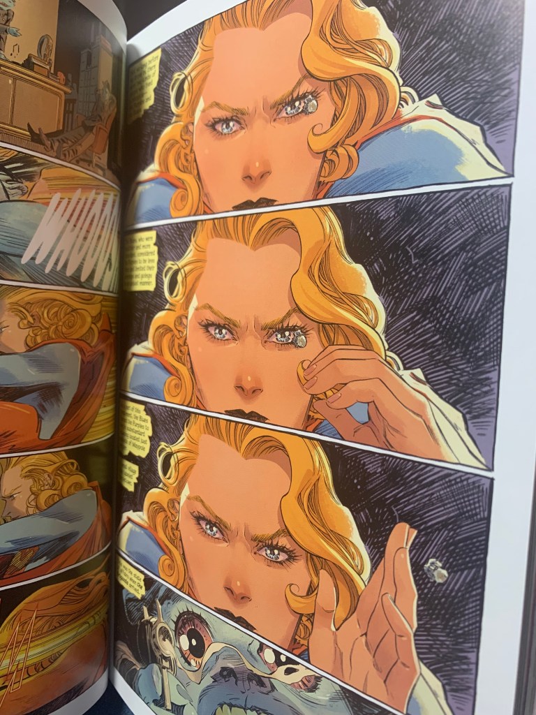 One of the most ingenious aspects of this graphic novel is that King and company waited until Book Six (of eight books) before getting into Supergirl’s origin story. Normally, obviously, the origin story would kick things off. Instead, we don’t get it until Book Six, where Supergirl relents in telling Ruthye what happened with Krypton. She does so in case Krem and the genocidal warriors kill her. I already mentioned what Supergirl endured, and I’ll add to it, the death of her mother, but the panel in particular that had me getting goosebumps and teary-eyes at the same time was her father, Zor-El. Taking a page from Jor-El’s book, he builds a rocket with the last bit of lead left on the asteroid they’ve taken refuge on, and plans to send Supergirl far, far away. Like with Superman, the rocket is only big enough for one person. She wants to know from her father: “Why me?” He responds simply, “You are my little girl. And I will save you.” So good. (King had a different version of Book Six, where the first half is Supergirl and Othan, the leader of the Brigands, trying to arrive at some sort of truce. She then tells him that aforementioned origin story. King’s editors, rightly in my estimation, said that it was a “swing and a miss” and to try again. Thank goodness for editors!)
