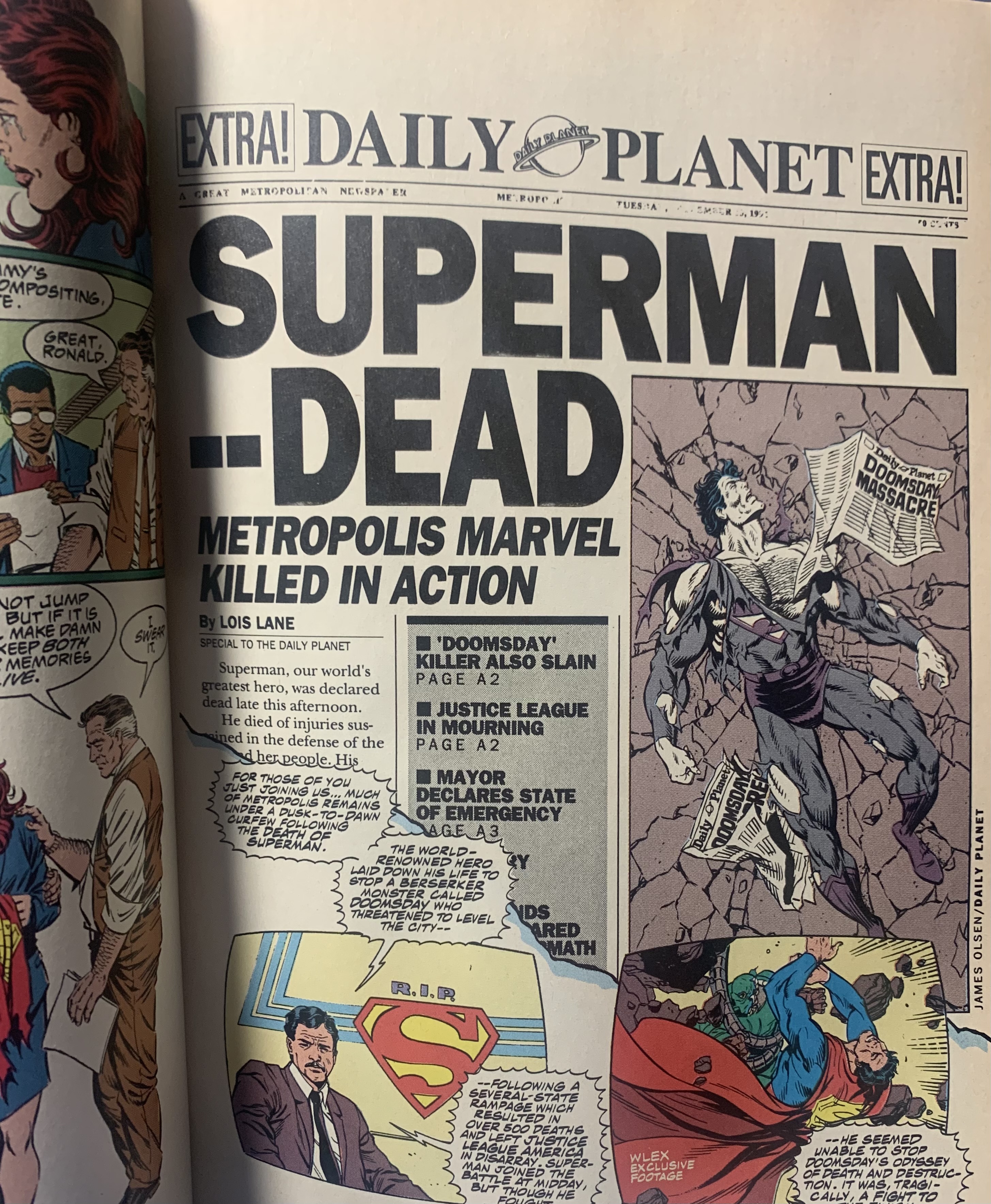Naturally, after Superman is seemingly killed by Doomsday, with the latter also succumbing to injuries from their building-destroying fight, the other superheroes, Lois, and the wider world are incredulous. Superman can die? Surely, he only seems dead because we have no way of accurately measuring his health metrics owing to his invulnerability. Try as they might, though, Superman shows no indication of brain activity, a pulse, or breath. He is dead. Right away, the government wants his body to scrape enough DNA to make a Superman clone. Lex Luthor II (sporting an incredible mane of red hair), who is somehow in bed with (quite literally) Supergirl, is the most distraught, not because of his love for Superman, but out of the pure hatred manifest in the desire to be the one who killed Superman. Doomsday robbed him of the opportunity. Newspapermen and television news are eager to have Jimmy Olsen’s incredible shots of Superman’s final moments. Ostensibly, they say it is to honor Superman, but Olsen understands it as exploitative. The Gangbuster, who was retired and is watching his girlfriend’s kid, is aghast when the kid doesn’t seem to care about Superman’s death. The kid quips, “Most of us kids at school thought he was a weinie anyway.” That’s a nod to the idea in the 1990s that Superman was no longer cool. Perhaps that also spurred on the idea of doing something bold, like killing Superman, to remind everyone how necessary Superman is to the world of comics and to the world outside of comics. And we even get a moment with the Linear Men, created a couple years earlier by Jurgens, who police time in the comic universe. A newly-minted Linear Man wants to save Superman, but he comes to realize doing so would grant Superman immortality, and where does such time intervention end? What about saving Martin Luther King, Jr? And so on. Before he allows time to restart and Superman to die, the Linear Man says, “You are nothing less than a miracle. But I am obligated to do the right thing.” Which is what Superman would want. I thought that interlude, if you will, was necessary and quite well-done. Another great vignette was the Justice League superheroes responding to the many letters Superman received from regular people with all sorts of requests. It was neat to see Wonder Woman, Flash, Green Lantern, and the others carrying on Superman’s legacy in that way. As Wonder Woman remarks, “For once, rather than combat threats, we want to help bridge the gaps that separate us all.”